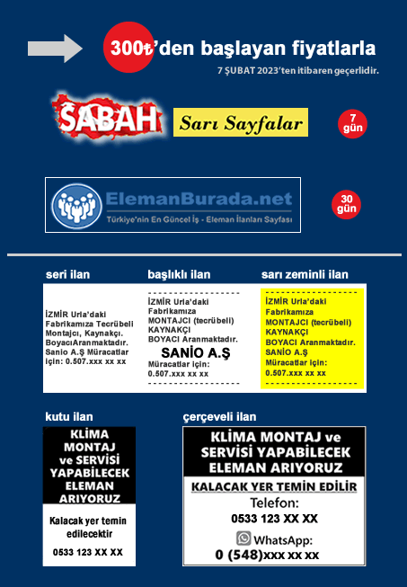 Sabah gazetesine 2+5 gün kampanyalı eleman ilanı verin;